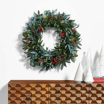 Bright red berries shine like jewels against a lush backdrop of leafy olive stems in our remarkably realistic faux wreath. A quick way to ready your home for the holidays, the wreath festoons a doorway or mantel with the look of real botanicals that will last the holiday season and beyond. Our olive and red berry wreath is a Crate & Barrel exclusive.