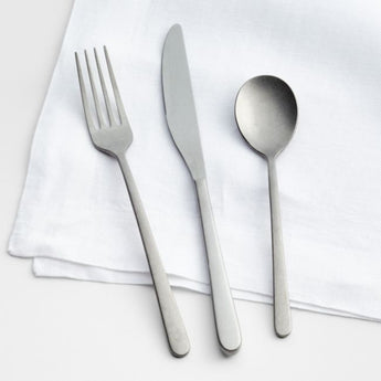 Las curvas discretas y los mangos delgados dan forma a nuestros cubiertos Craft, modernos pero atemporales. Hecho de acero inoxidable que ha sido pulido para lograr un acabado texturizado mate y una apariencia hermosamente habitada, el lugar rústico y moderno eleva cada comida, sin importar cuán informal o elegante sea. El cuchillo, el tenedor y la cucharilla crean una mesa sencilla y elegante acompañada de las otras piezas de nuestra exclusiva colección de vajillas, utensilios para servir y mantelería Craft.