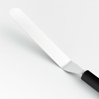 Spread and smooth buttercream, ganache, jam and meringue with our large offset icing spatula. Mirror-polished stainless steel shapes the sleek cake-decorating blade, while the soft-touch handle with a refined beveled edge provides a sturdy, comfortable grip. Combine with the other pastry tools in our exclusive Crate & Barrel collection for a well-outfitted workspace that's up to any baking challenge.