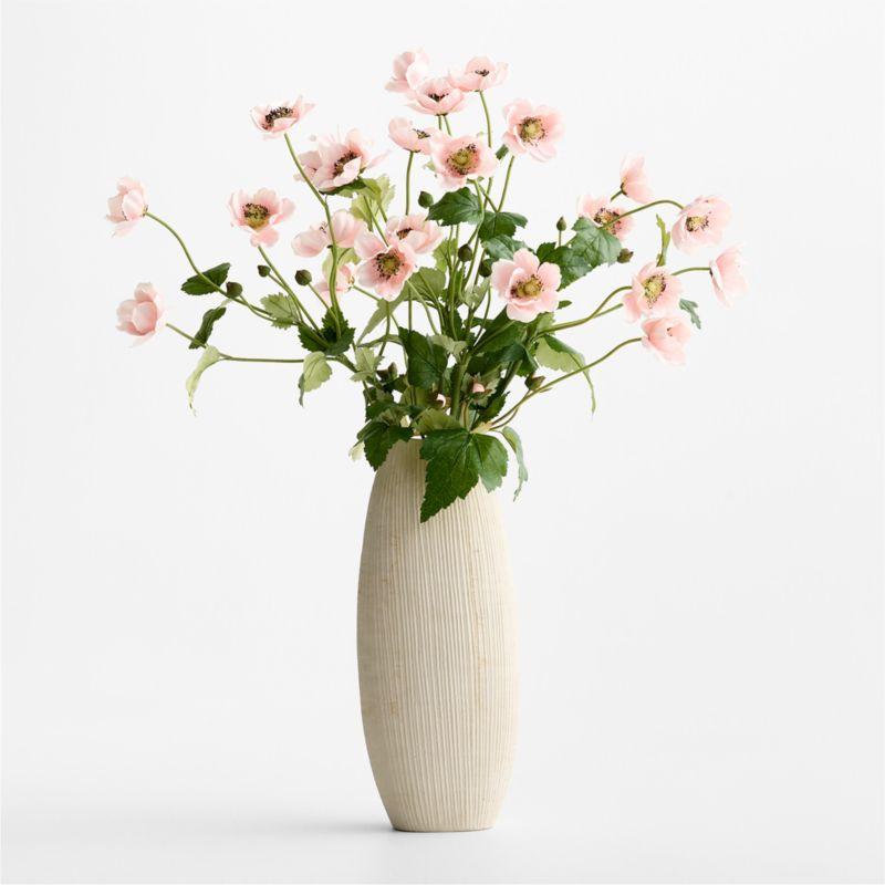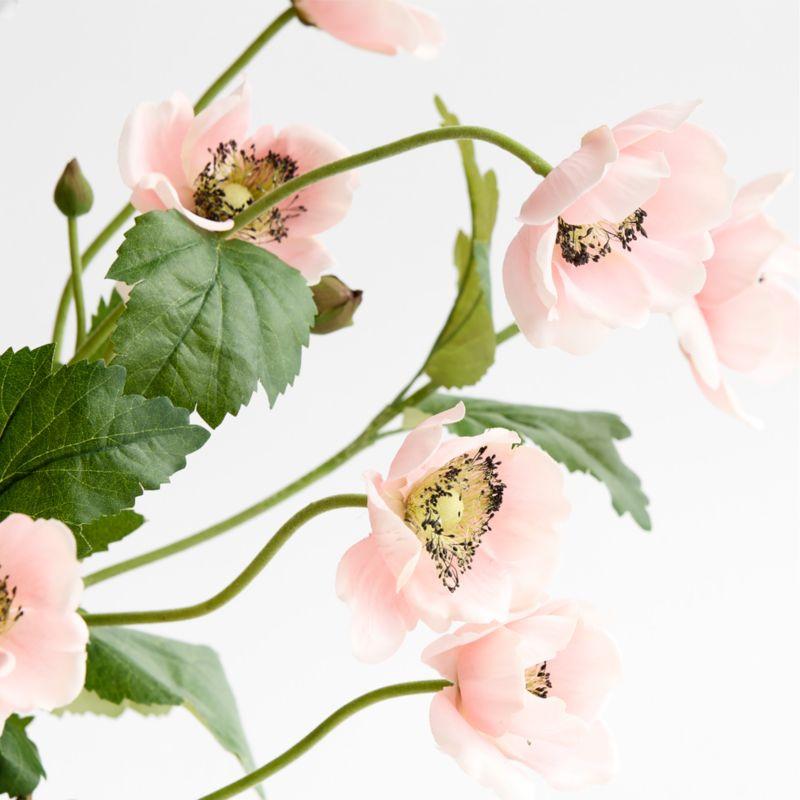 Our faux Japanese anemone spray looks as if it were just clipped from the garden. Supported by slender stems that bow gracefully, sweet pink petals surround the sunny yellow centers. A sprinkle of black anthers adds contrast and irresistible interest to each blossom. Tall and architectural, the branch stands on its own in one of our floor vases or weaves delightfully amongst other faux stems in a seasonal spring display.