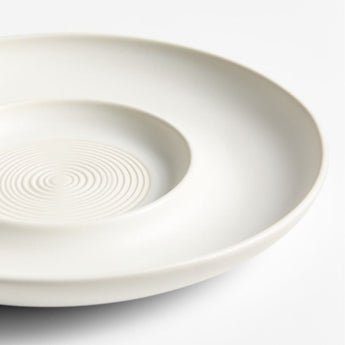 Named after the Mediterranean style of communal, small-plate dining, our Mezze collection is designed for casual, no-fuss entertaining. Designed as a one-piece way to serve bread and olive oil, the platter features a wide rim to hold pieces of torn baguette and a central low bowl for dipping oil. Use the center ribbed surface to flavor the oil with rubbed garlic cloves or lemon rind. Each ceramic platter is finished by hand with an off-white reactive glaze that will vary slightly and make each piece unique.