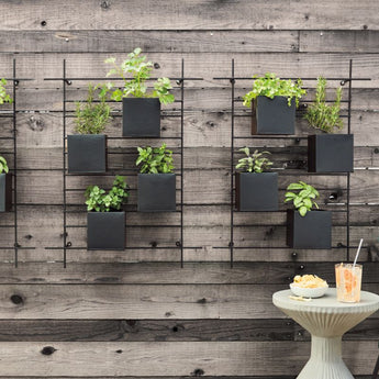 Our contemporary, architectural planter makes great use of wall space. Made of black-coated steel, four removable box planters can be arranged anywhere on the wall-mounted rails and will look amazing filled with small or trailing plants.