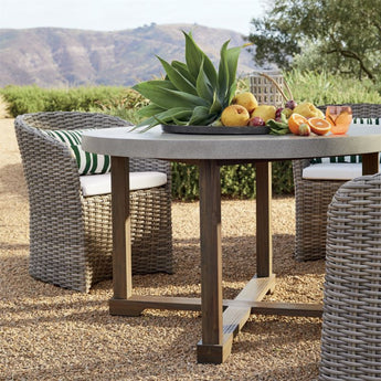 The casual, industrial beauty of concrete offers modern contrast to gorgeously grained acacia wood for an outdoor dining table with serious style and substance. Rising from an X-shaped base boasting mortise-and-tenon joinery, four sturdy acacia posts kiln-dried for strength and durability support the tabletop. Finished by hand and sealed for optimal weather resistance, the round concrete top provides room for four.