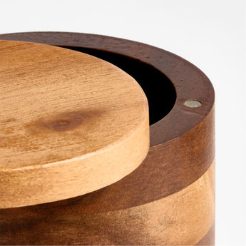 Beautiful acacia wood exhibits its rich grain in a natural salt cellar with a convenient and charming swivel lid. Use one to present your favorite sea salt, or group a few to serve red pepper flakes and dried herbs. Our exclusive acacia salt cellar pairs beautifully with our other acacia wood serving and entertaining pieces.