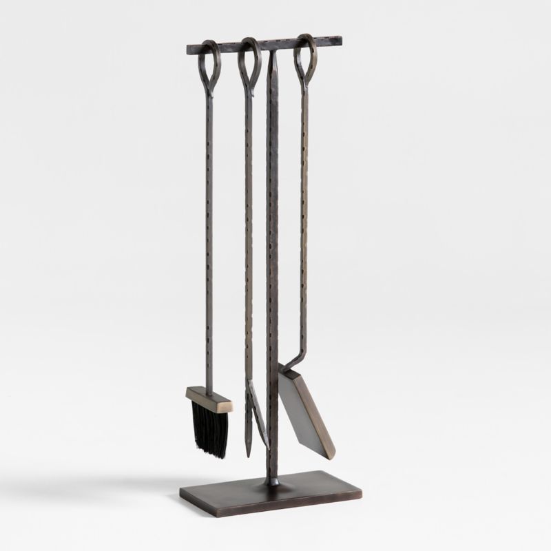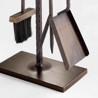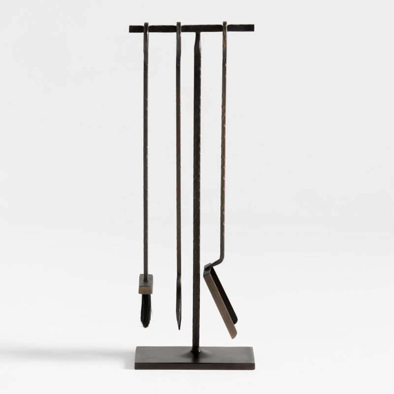Hammered texture, traditional looped handles and a warm antiqued brass finish lend rustic appeal to our simply styled fireplace poker, brush and shovel handcrafted of wrought and sheet iron.
