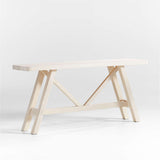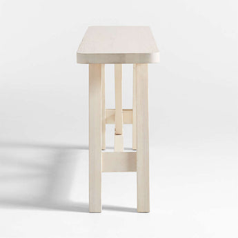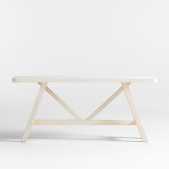 Modern architectural lines muted by washed painted finish make this solid pine console table work with any style. Angles, slants and straight edges draw the eye to the trestle base, while the simple plank top recalls the well-worn look of a farmhouse table. The warm white wood table lightens a room and will develop its own unique lived-in character and rich patina over time.