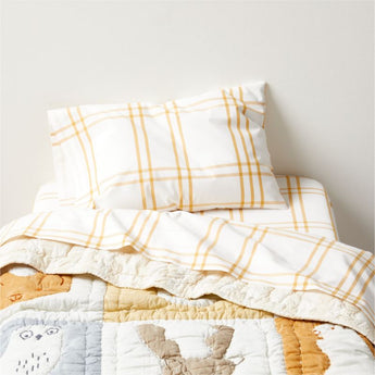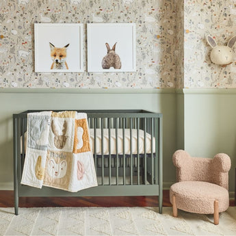 The modern, painterly design of our Forest Animals Crib Quilt turns abstract shapes into an adorable menagerie of animal friends. Hand-embroidered details give each critter a sweet facial expression that little ones will love. With a dynamic, gender-neutral color palette, it's made of 100% organic cotton and features a neutral buffalo check on the reverse and binding. Add the coordinating crib sheet and changing pad cover to complete the oh-so-fun look.