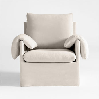 Our Piper Slipcovered Nursery Chair keeps things easy-breezy. The cream-hued slipcover is made of a gauzy cotton-linen blend that feels like a dream and brings a casually chic look to any room. The seat has a sink-into-it quality, while floppy arm pillows deliver extra comfort. And the ultra-smooth swivel and gliding motion make for relaxing feeding and rocking sessionsboth for you and your baby. Pair it with our Piper Slipcovered Ottoman for a totally coordinated look.