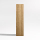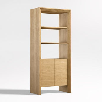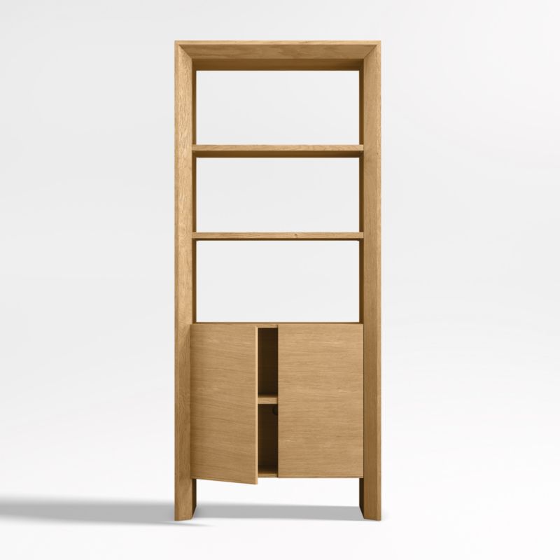 Named after the natural beauty found in the Baja Peninsula, our storage bookcase celebrates the organic richness of solid oak. Simple geometry and a natural stain put the focus on the wood's unique grain, knots and markings. Reverse chamfer edges and open shelving lighten the clean waterfall silhouette, floating a flat-fronted cabinet for closed storage. Rustic and timeless, the Baja natural oak bookcase is a Crate & Barrel exclusive.