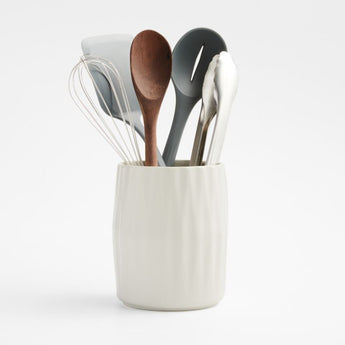 A subtly textured crock glazed creamy white corrals essential utensils in a modern mix of materials. Gleaming stainless steel tongs and whisk grab, flip, beat and whip. Made of heat-resistant nylon, the grey turner and slotted spoon flip and strain. A walnut wood spoon stirs and serves with natural beauty. The tongs feature a cap that twists to lock and unlock, while the other tools boast faceted handles that echo the graceful ribs of the ceramic utensil holder. This set makes a lovely and useful housewarming, graduation or shower gift.