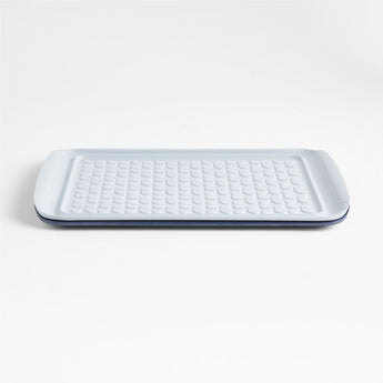 Solve the quintessential grilling conundrum of keeping raw and cooked meat safely separate with our exclusive set of trays. Stack the trays, load the top one with raw meat and carry to the grill. Once steaks and pork chops are on the grill, swap the trays. All juices from the raw meat are contained below, so the finished products can be placed on the clean top tray without risk of contamination. As a bonus, the tonal blue set is attractive enough to use for serving. When the feast is complete, put the two trays in the dishwasher for quick and easy cleanup.