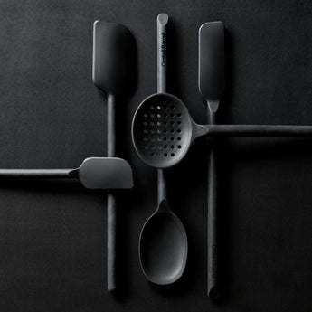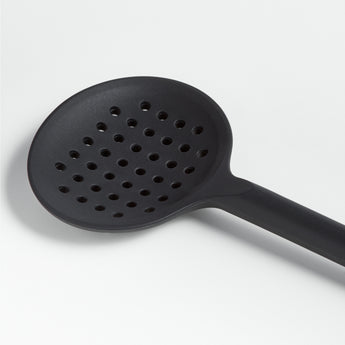 Stir, scoop and serve dumplings, pasta and peas with our signature black silicone slotted spoon. Constructed with a nylon core for strength, the black silicone utensil ably handles boiled potatoes and pot roast, while the grid of perforations allows liquids to drain away. Soft-touch silicone won't damage non-stick pans and resists stains, scratches and heat up to 600 degrees. We love the way the refined beveled edge finishes the elongated handle with a dynamic detail. Combine the dishwasher-safe slotted spoon with the other exquisitely proportioned utensils in our exclusive Crate & Barrel collection for a well-outfitted workspace that's up to any cooking challenge.