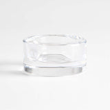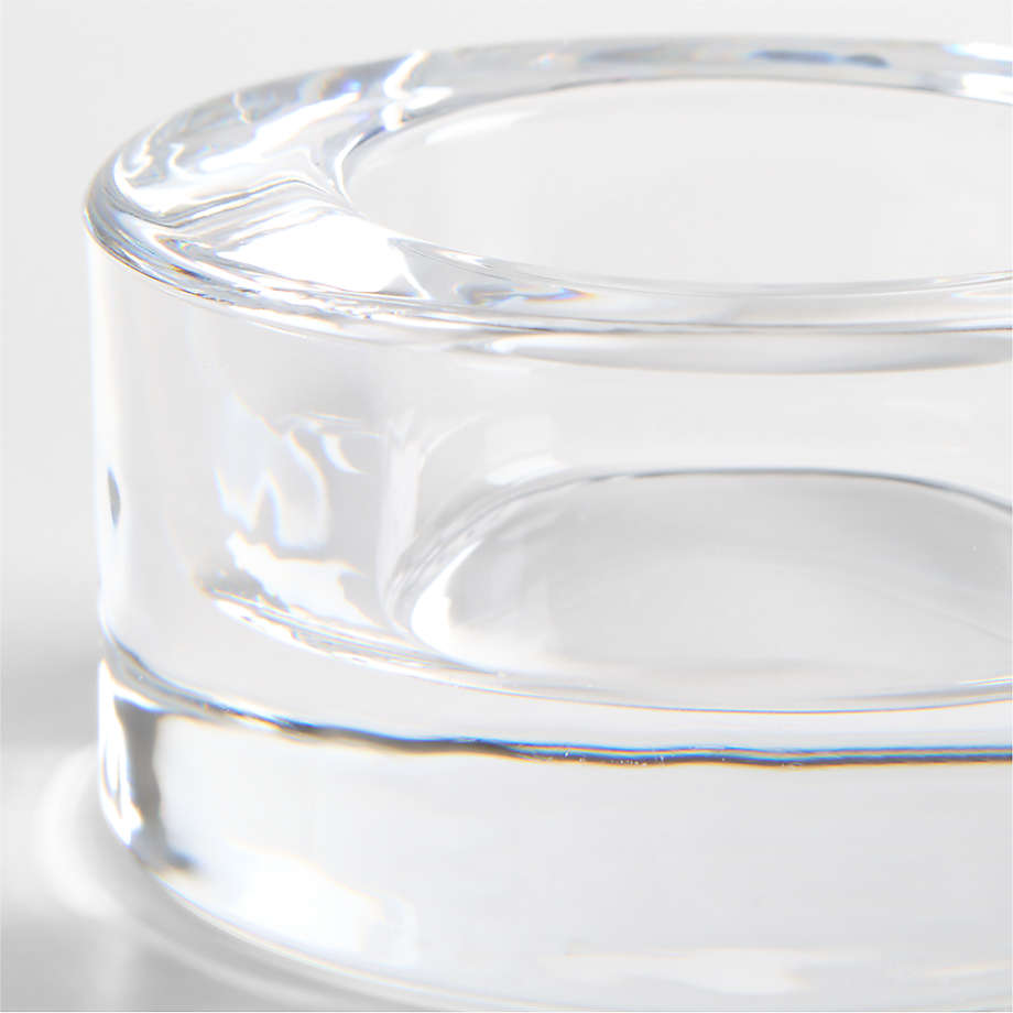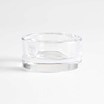 A favorite from the Crate & Barrel archives returns. Our Essential Modern tealight holder pairs artisan quality with timeless style. Hand-pressed by skilled craftspeople, the small candle holder encircles a tealight with a round of thick clear glass upon a substantial sham. Scatter multiples along a long dining table or fireplace mantel to create a modern-yet-cozy mood.