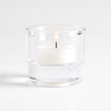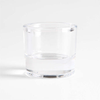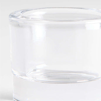 A favorite from the Crate & Barrel archives returns. Our Essential Modern tealight holder pairs artisan quality with timeless style. Hand-pressed by skilled craftspeople, the clear glass candle holder subtly elevates a tealight upon its substantial sham. Scatter multiples along a long dining table or fireplace mantel to create a modern-yet-cozy mood.