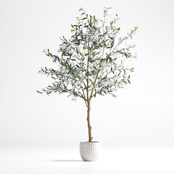 Lush, life-like and unparalleled in quality, our olive tree brings a touch of the Mediterranean to your decor. Skillfully crafted to look just like the real thing, the seven-foot-tall botanical graces the home with the same silvery green color and graceful lance-shaped leaves of an actual olive tree. The effect is so convincing, your guests will marvel at your green thumb, yet there's no maintenance or natural light needed. Just place the olive tree anywhere that needs a boost of (faux) greenery. Although already potted in its own black plastic container, we recommend "planting" it in one of the many attractive planters (sold separately) in our collection.