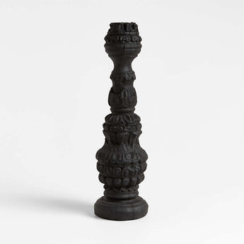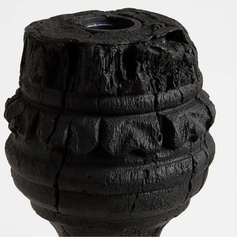 Inspired by an intricately carved found column, this large candle holder commands attention with its height, matte black finish and rustic texture. Skilled artisans paint each one by hand, giving the cast fiberglass and resin candlestick the look of a rough-hewn artifact. We're obsessed with the drama the faux-charred finish brings to a dining table or mantel.