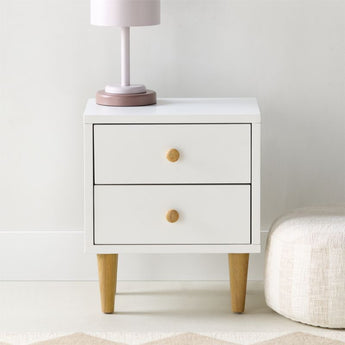 Clean lines, elevated paneling and a classic white finish: We're here for it. Largely inspired by Scandinavian farmhouse design, our Finn kid's furniture collection blends rustic charm and modern minimalism without skipping a beat. Detailed with legs and knobs in a natural finish, the tonal simplicity makes perfect sense in a nursery but can easily translate into big kid-approved styles as they grow. Two roomy drawers keep nighttime essentials at the ready or bulky items out of sight.