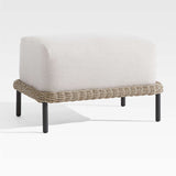 The definition of coastal modern, our Grotto outdoor collection brings a breezy look to classic wicker with sculpted silhouettes and clean-lined, sink-in cushions. All-weather resin wicker weaves the ottoman's breezy base, which rests on slim stainless steel legs finished in matte black. The delightfully soft seat cushion beckons with bold proportions and polyester upholstery in fresh ivory. The Grotta outdoor wicker ottoman is a Crate & Barrel exclusive.