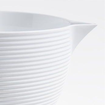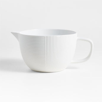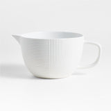 Inspired by our best-selling Hanno salt and pepper mill collection, this batter bowl features the same tactile appeal and on-trend fluted detail. The white porcelain is textured with both horizontal and vertical ribbing for multidirectional linear interest. Matte on the exterior with a glossy-glazed interior for easy cleanup, the spouted and subtly textured bowl mixes and pours batters, glazes and sauces with a timeless balance of beauty and practicality.