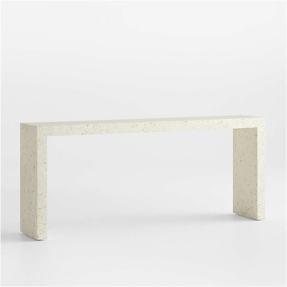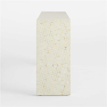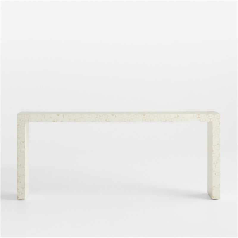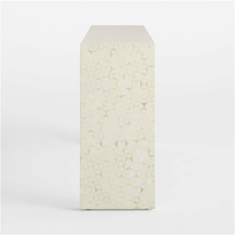 True to the tradition of intarsiathe time-honored technique of fitting together bits of wood in a mosaic-like designskilled craftsmen inlay triangles of handcut resin and bone to create this artisanal console table. The simple Parsons-style design lets the workmanship and materials take center stage, allowing this exclusive, one-of-a-kind piece to take center stage.