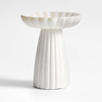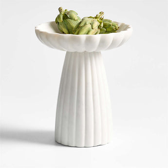 Our Jolie collection was designed with a classical look and modern versatility. Cut and polished by hand, the white marble pedestal plays on the aesthetic of a Doric column. We're especially obsessed with the way the ruffled bowl and fluted base animate the natural stone with soft shadows and highlights. The tall narrow pedestal elevates everything from fresh fruit to bangles to a pillar candle. Fascinating variations in the marble make each one unique.