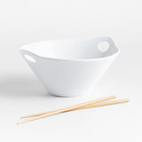Modern Asian serving shape in white porcelain rests bamboo chopsticks in the cutout handles. The deep, conical bowl is just the thing for serving pad thai, Vietnamese beef noodle salad and cold peanut udon noodles. The handles make carrying hot meals to the table safe and painless, and the sturdy bowl is microwave- and dishwasher-safe. Serve your favorite noodle dishes into our smaller Kai noodle bowls and plates.