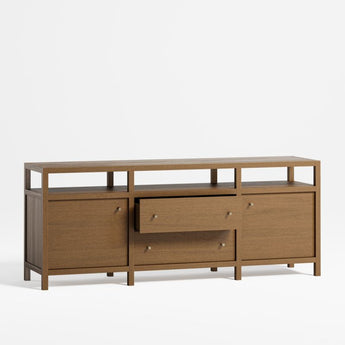 Refined and bold, Keane takes media storage to the next level. Scaled to create a stately presence in the living or family room, each piece is crafted of beautiful mahogany and meranti wood with a light driftwood finish that puts the focus on the wood. The media console flanks a central set of drawers with roomy cabinets, all styled with flat fronts and dotted with small brass-finished pulls. Channel detailing on the sides enhances the console's clean, architectural lines. Open shelving on top highlights media components, books or collectibles. Our best-selling Keane collection is a Crate & Barrel exclusive.