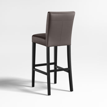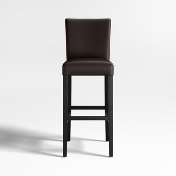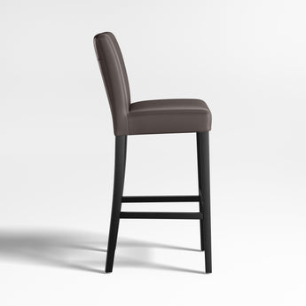 Classic Parsons-style design is echoed in our Lowe leather stools, upholstered in soft, pebble-textured bicast leather in a dusky smoke hue. Stylish and contemporary stools scaled especially for bars and counters offer a comfortable, roomy seat and long, lean profile. Double saddle-stitched tailoring refines the cushioned tight seat and back perfectly proportioned to the frame's slim ebony-stained legs. The Lowe Smoke Leather Stools are Crate and Barrel exclusives.