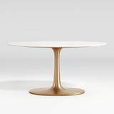 Nero curves mid-century modernism in a new direction, mixing metal and marble in a forward-thinking oval design. An oval of pristine white marble tops a sweeping trumpet base of iron finished in gleaming brass. Distinguished by veining that's unique to each table, Nero seats up to four for brunch, dinner and game night. ^ The Nero oval white marble dining table with brass base is a Crate & Barrel exclusive.