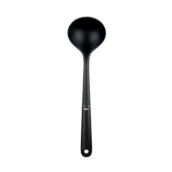 The essential kitchen tool, in heat-resistant, safe-for-any-cookware nylon for worry-free cooking. This ladle boasts a slender, non-slip Santoprene handle with a modern chrome-plated zinc accent and hanging hole. The black scoop looks sleek and contemporary corralled in a utensil holder on your kitchen countertop. Nylon with Santoprene® handle. Chrome plated zinc logo/ring. Heat-resistant to 400 degrees. Dishwasher-safe