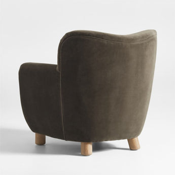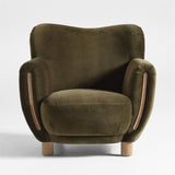 A wingback update with a vintage vibe, our Rumford chair has the unique look of a refurbished find. Sculpted with gentle curves, a tight back and thick seat cushion, the chair gets extra design points from inset wood details on the arms, pleated tailoring and bold dowel-shaped oak legs. Velvet upholstery in olive green adds to the chair's generously cushioned embrace.