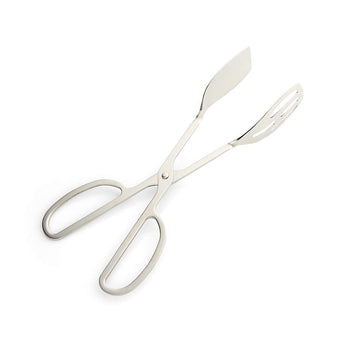 Stainless steel tongs with convenient scissor handles and spoon and fork heads serve, turn, transfer and toss all manner of foods and clean up in the dishwasher without rusting.