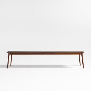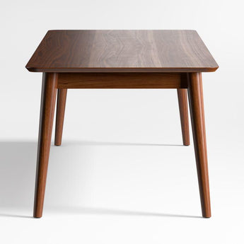 Our 1960s-inspired Tate extension dining table recalls the timelessness of mid-century design with a tailored profile and streamlined shape. Crafted of walnut veneer, the table epitomizes the clean lines of modern design with a streamlined beveled top. Integrated with the table's slim apron, conical legs taper down at a subtle angle. Ready to accommodate extra dinner guests, the table includes two 18" self-storing leaves that expand seating from 10 to 14. Designed by Blake Tovin, the Tate walnut extendable dining table is a Crate & Barrel exclusive.