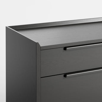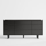 Our 1960s-inspired Tate collection recalls the timelessness of mid-century design with tailored profiles and streamlined shapes. Crafted of ash and hardwood veneers finished in black, the dresser presents a continuous front with nine drawers of varying size with design-savvy gallery fronts, linear undercut drawer pulls and tapered turned legs. Designed by Blake Tovin, the Tate nine-drawer dresser is a Crate & Barrel exclusive.